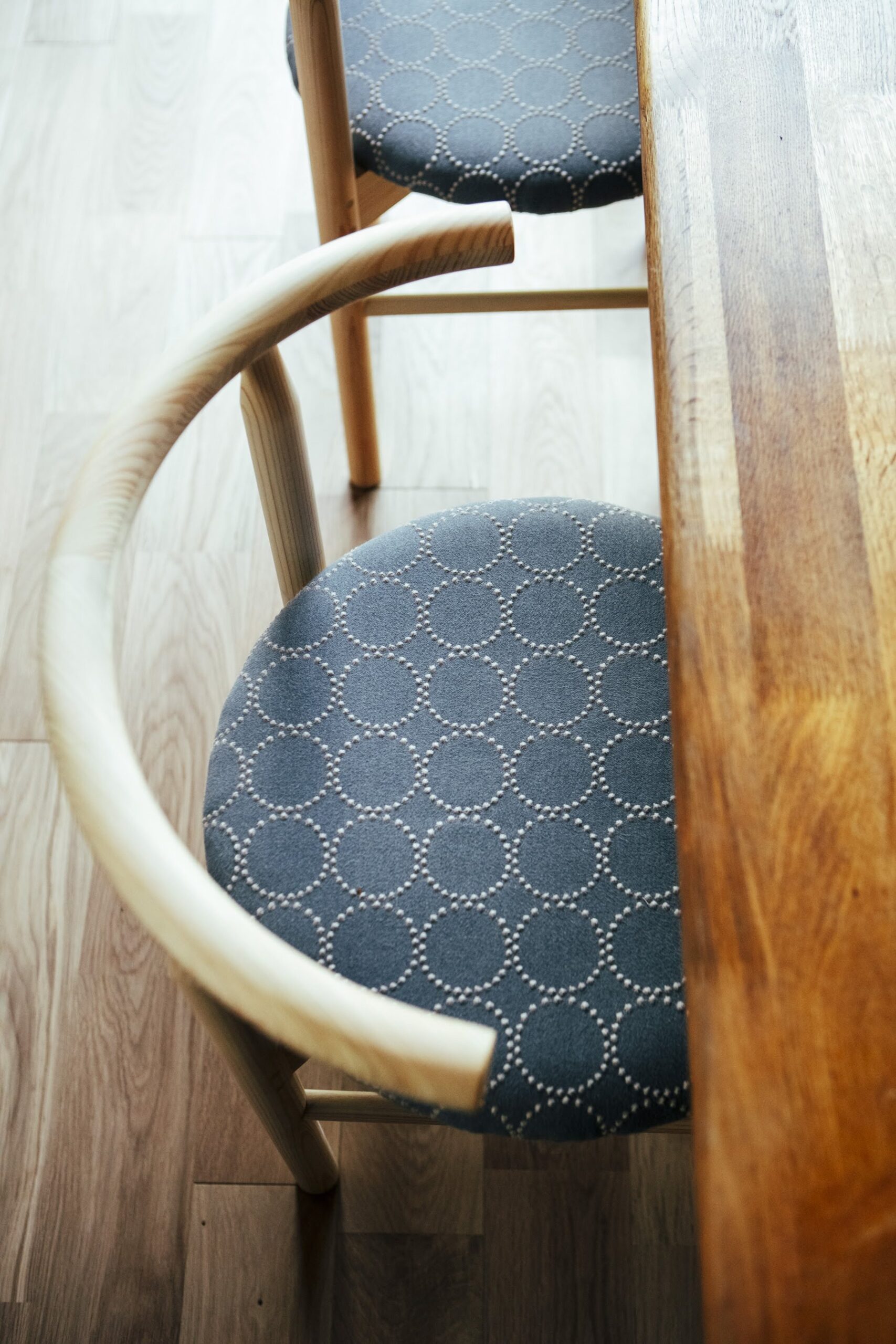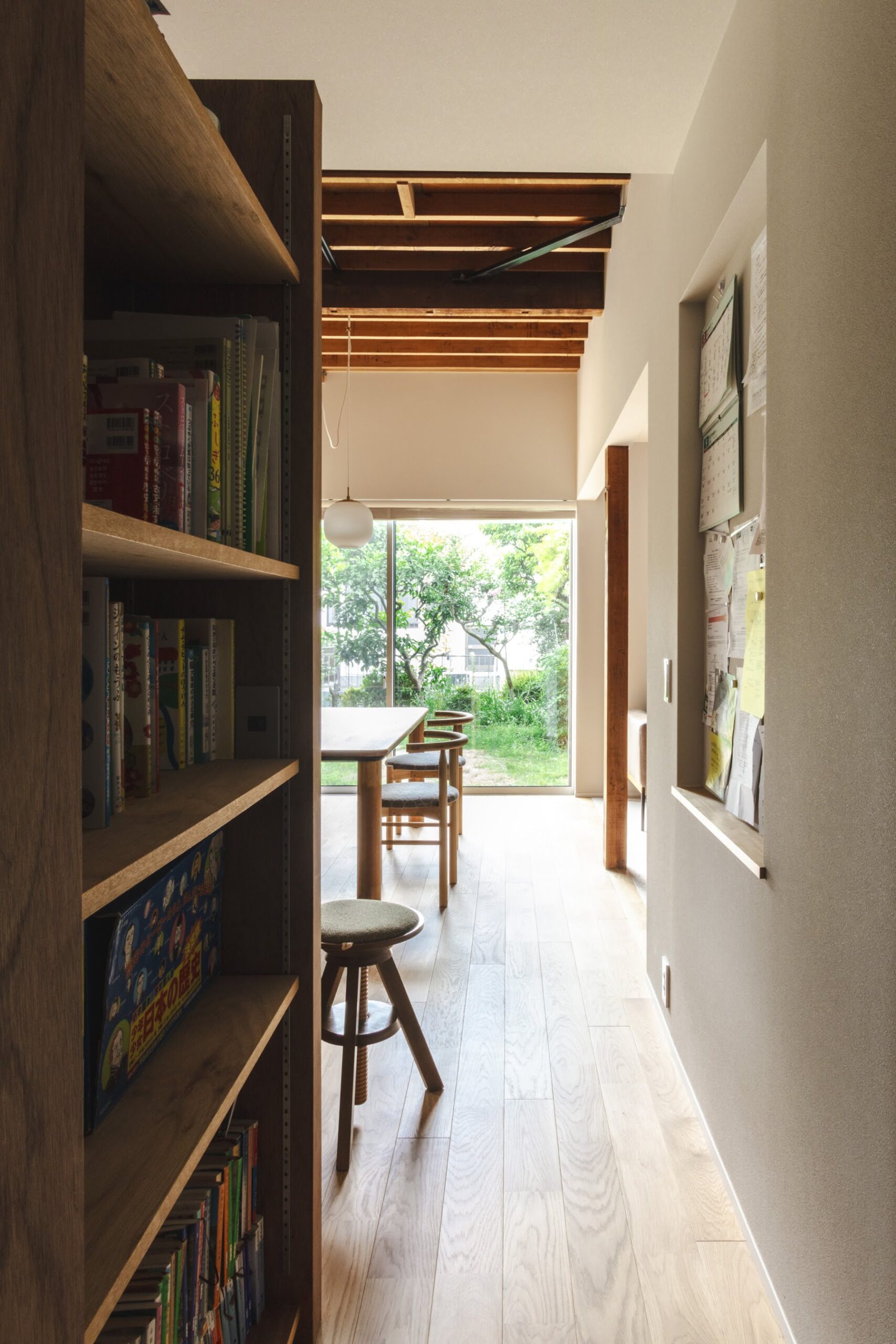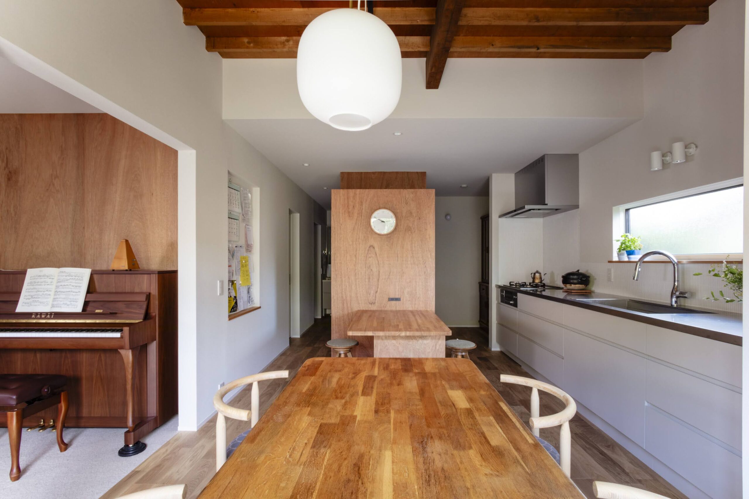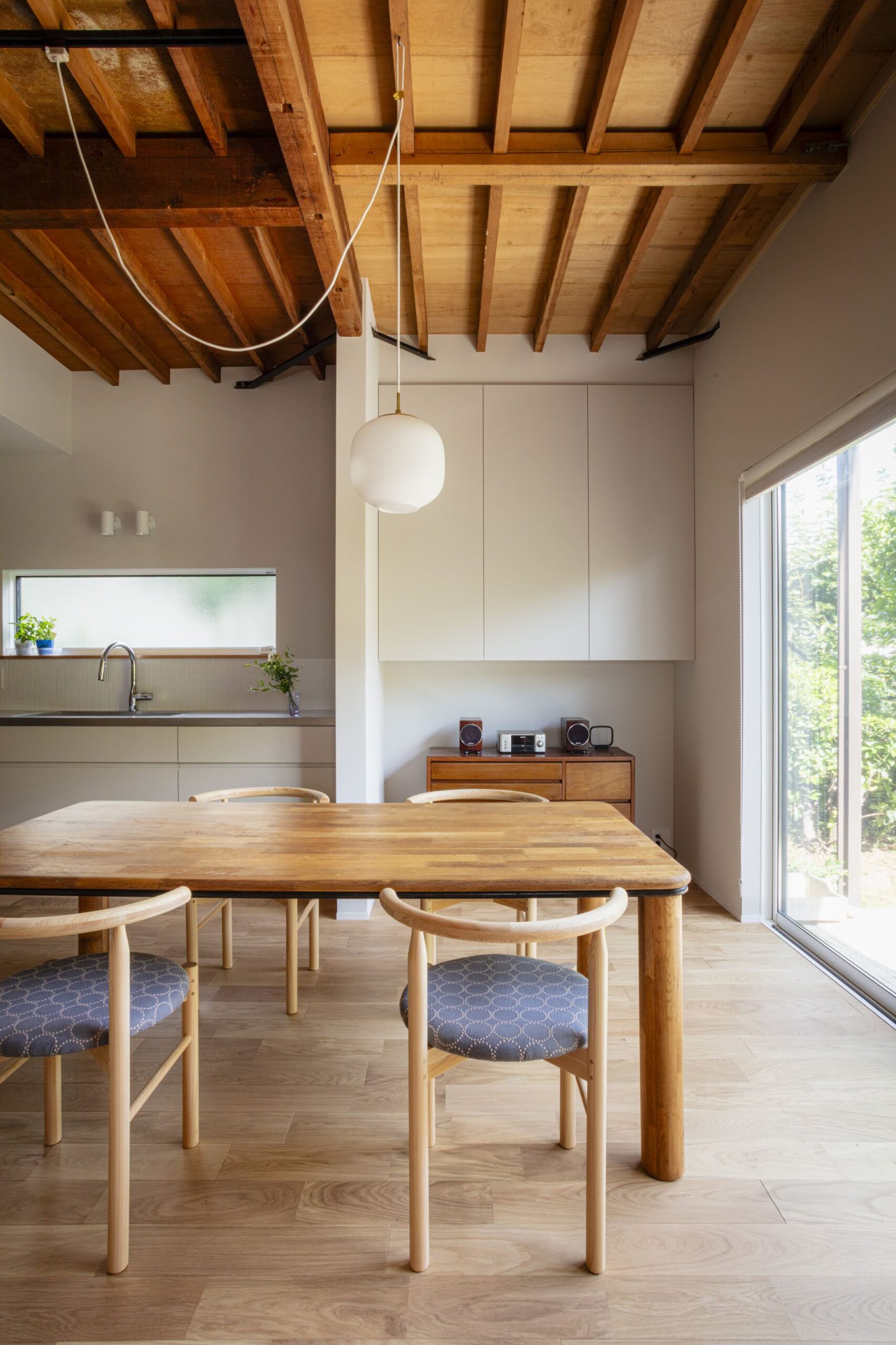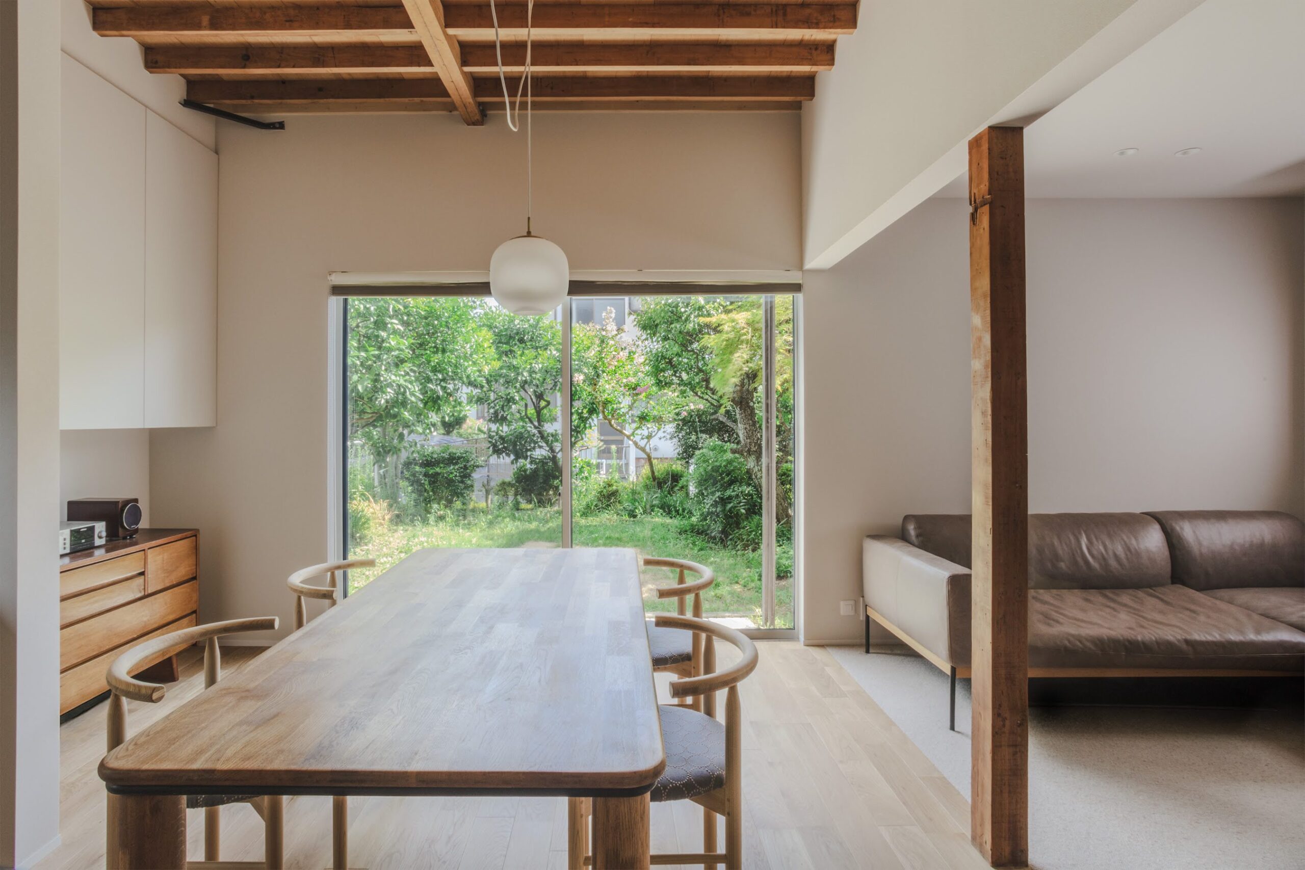 間取りの再構成では、耐力壁の配置を工夫。1階にはファミリークローゼットやアウトドア用品を収める納戸を設け、これらの壁を補強壁としました。庭に面した部分は開放的なダイニングとし、その一方で補強壁を活かして、イングルヌックのような小さなくつろぎの場をつくり、空間に多様な居場所を生み出しています。