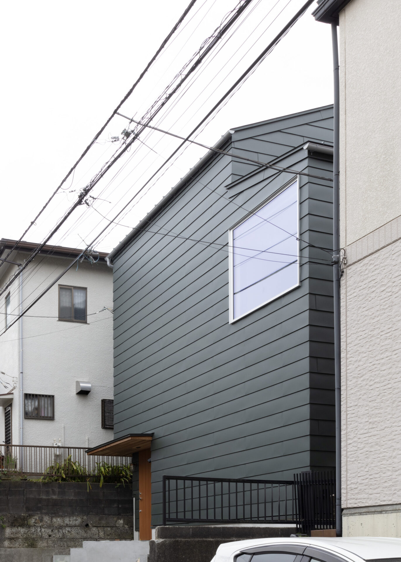 柿の木のある敷地に建つ延べ床面積25坪のコンパクトな住まいです。限られた敷地の中に柿の木を移植した小さな庭を設けました。庭を起点として吹き抜けの居間や和室を設けました。