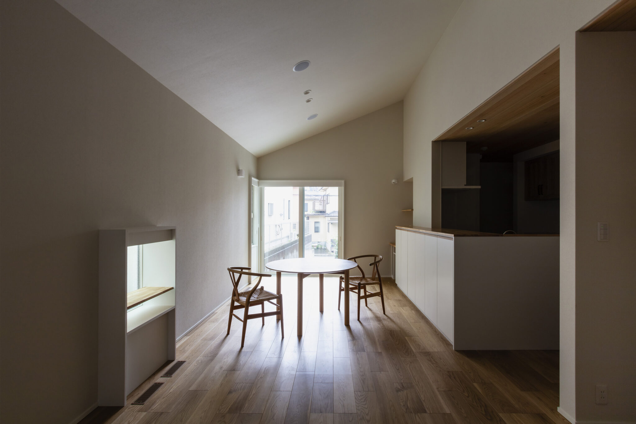 旗竿地に建つ四方を隣家に囲まれた住まいです。唯一開かれた敷地内通路の先に食堂と居間を配置しました。大きな空間に四方から光が差し込み、光と影が時間と共に変化します。 竣工年月:2024.5所在地:神奈川県構造・規模:木造 … 続きを読む 西寺尾の家 […]